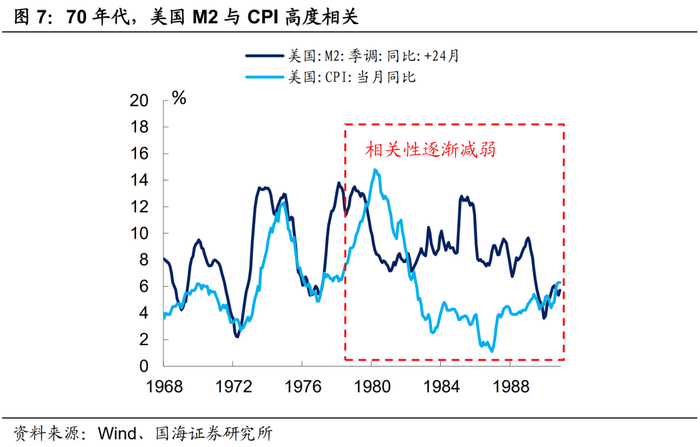 (2)70年代至90年代,弗里德曼的货币主义大获全胜。美国经济增速开始下滑,石油危机的爆发使得通胀抬头。凯恩斯主义在滞涨时期逐渐“退潮”,而弗里德曼的货币主义渐渐站稳了脚跟。当时对于美国盛行的“大通胀”现象,学界普遍认为是一种货币现象。从1970年起,美联储主要以货币供应为政策调控的中间目标。1980年开始,由于新型金融工具的创立,货币增速和CPI增速逐渐脱钩,这也为最终美联储将利率设为中间目标埋下伏笔……