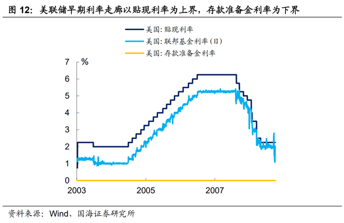 我们之前提到了,美联储的通过货币政策工具来调控其目标利率——联邦基金利率。那么美联储是如何实现升降息操作的呢?正如世界上大多数央行一样,美联储也有自己调控利率的“走廊体系”。2000年以来,美联储的利率走廊体系演变大致分为三个阶段: