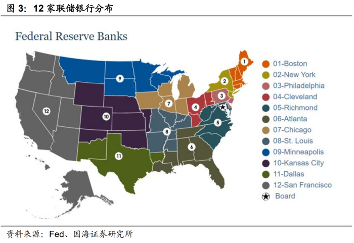 (2)“两翼”之一:12家联储银行(Federal Reserve Bank)。主要负责美联储与各地商业银行的沟通交流和业务往来,其职能包括贴现、监管、清算、以及担当国库。联储银行的股东或出资人是当地商业银行。