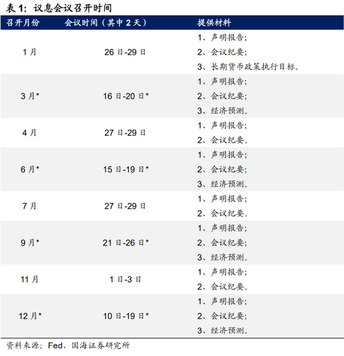 公开市场委员会(Federal Open Market Committee,下称FOMC)已经成为美联储货币政策的执行主体。一般而言,议息会议为期两天,在议息会议结束后,美联储还将举行媒体招待会。与会期间FOMC成员将根据美国当下经济、金融形势及未来展望,制定下一步货币政策执行计划。FOMC每隔1个半月召开1次议息会议,每年共举行8次,分别为每年1月、3月、4月、6月、7月、9月、11月以及12月。值得一提的是,2020年由于疫情原因,仅3月份1个月就召开了5次议息会议。