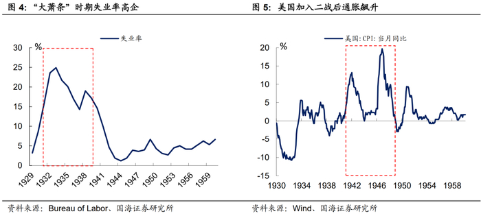(1)1960年以前:迷失的美联储。1920年代,美国无节制的消费鼓吹起了巨大的经济泡沫,虚假的繁荣背后暗藏杀机。1929年股市的崩塌,彻底戳破了“美国梦”。伴随着大量的股票抛售,银行、企业纷纷倒闭,美国无可挽回地进入“大萧条”时期。在此格局下,失业率一路攀升,最高时期一度达到了24.9%。然而由于缺乏政策工具,为了防止资本外流,美联储在“大萧条”时期依旧选择了加息,这促成了失业率的持续高位运行。直到罗斯福上台后,经济才开始有所起色。