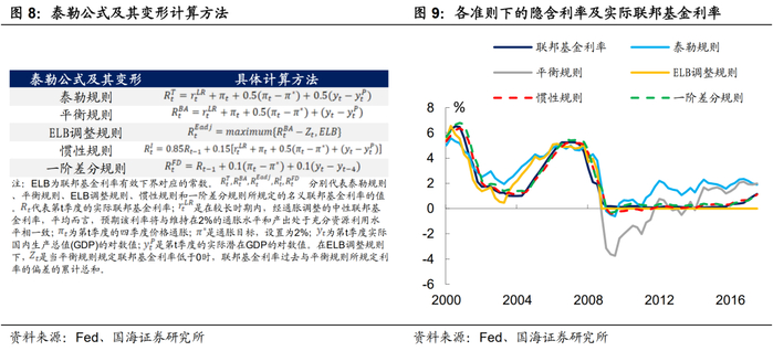 历史上来看,次贷危机以前,“泰勒公式”及其变形公式的隐含利率对目标联邦基金利率均有较好的拟合作用。次贷危机后,由于联邦基金利率已经降至“零区间”,处于降无可降局面,联邦基金利率和“泰勒公式”隐含利率出现了较大幅度背离。虽然美联储在实际制定货币政策时需要考虑的变量不仅仅局限于就业和通胀,但是“泰勒公式”收到了历届美联储主席的广泛肯定,为利率制定提供了一个重要的参考标准。