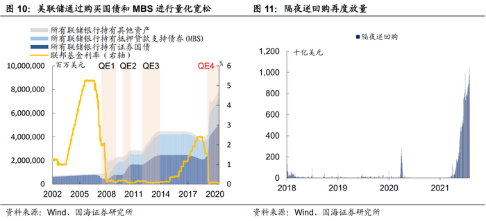 为此,2013年美联储推出了隔夜逆回购(O/N RRP)作为利率体系中的“次底”,对联邦基金利率进行托底。其原理是,在超额准备金利率下再设置了一项隔夜利率,覆盖众多大型银行和货币基金。隔夜逆回购由美联储的对手方发起,美联储通过向对手方出售国债及MBS,到期再购回,以此来达到让过剩的流动性回到美联储手上的目的。