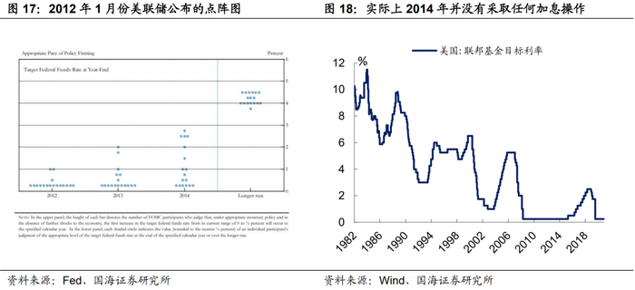 6月份的议息会议结束后,2022年美联储将进行两次加息操作的“论调”不绝于耳。然而历史上来看,点阵图对实际加息情况的预测作用较差。2012年1月份也出现过类似情形,当时点阵图显示,预计2014年将出现两次加息操作,事实上,美联储上一轮加息在2015年底才开启。因此,点阵图实际上并非是预测联邦基金利率变动的有效指标,更适合作为一个用来观测联储官员对当前货币政策态度的工具。