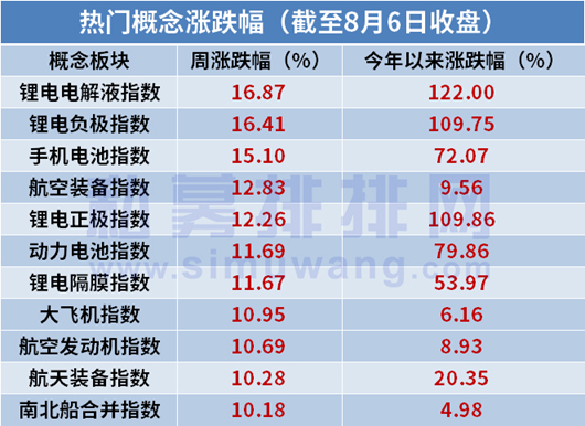 热门概念指数方面,完全是锂电和军工的“狂欢”。上周锂电电解液、锂电负极涨超16%,年内均已实现翻倍。航空装备、大飞机等军工相关指数也上涨超过10%,实现年内涨幅翻红。