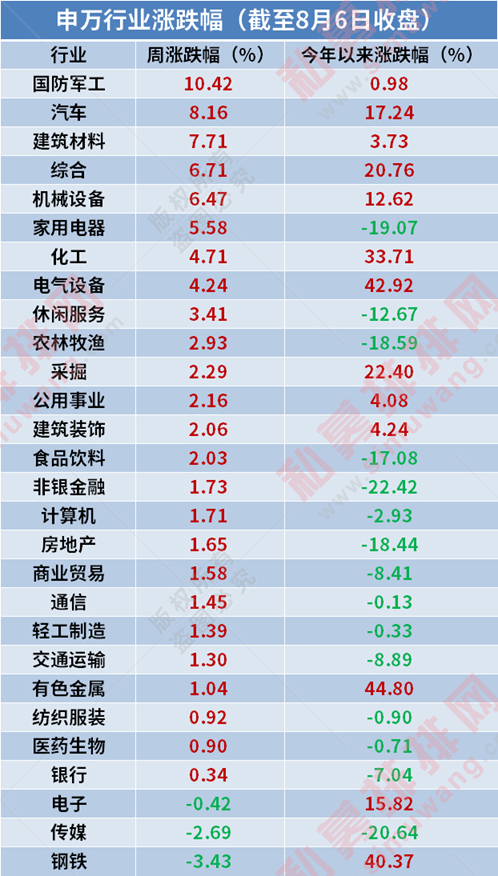 申万一级行业中,曾被称作“渣男”的军工板块迎来了“咸鱼翻身”的机会,上周大涨10.42%,一举将年内的累计跌幅抹平。在一周内抹平年内跌幅、实现翻红的板块还有建筑材料,单周大涨7.71%实现逆袭。