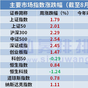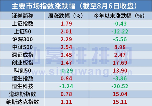 上周(8.02-8.06),各主要市场指数大多翻红,A股行情回暖并企稳,其中上证指数、深证成指的涨幅分别为1.79%、2.45%,久违地超越了创业板指。另外,沪深300指数在上周触底出现明显回升,但总体来看中证500指数的涨势依然优于沪深300。表现相对弱势的是科创50与恒生科技指数。