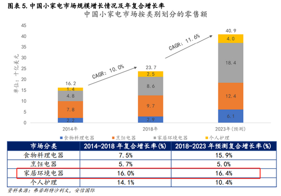 据咨询公司Frost & Sullivan预测,2023年中国家居环境电器的市场规模将达到40.9亿美元,2018-2023年复合增长率可达16.4%,位于小家电行业细分领域的首位。