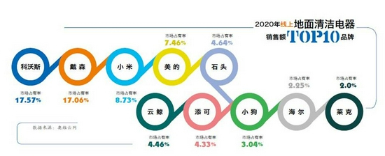 作为家庭清洁电器行业的头部品牌,小米的市场占有率一直没有突破科沃斯和戴森。据奥维云网数据显示,2020年地面清洁电器类别中小米的市占率为8.73%,虽然排名第三,但和前两名相比,还是相差甚远。