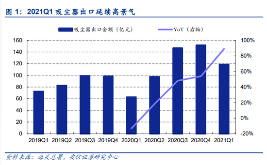 据海关总署披露,清洁家用电器中,2021第一季度中国吸尘器出口金额YoY+89%,同比增长64%,环比提速(2020Q4吸尘器出口金额YoY+54%)。