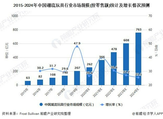 Frost Sullivan数据预测,中国的潮玩零售市场2024年将达到763亿元,但从2021年开始增长率将逐步降低。2019年泡泡玛特的在潮玩行业的市场占有率虽然位列第一,但与第二名相差也不过0.8%。