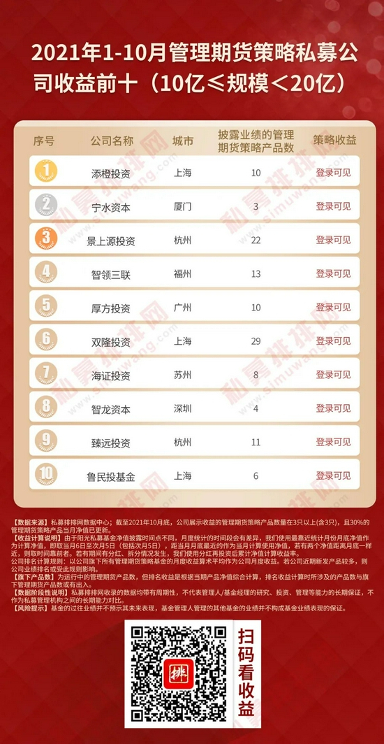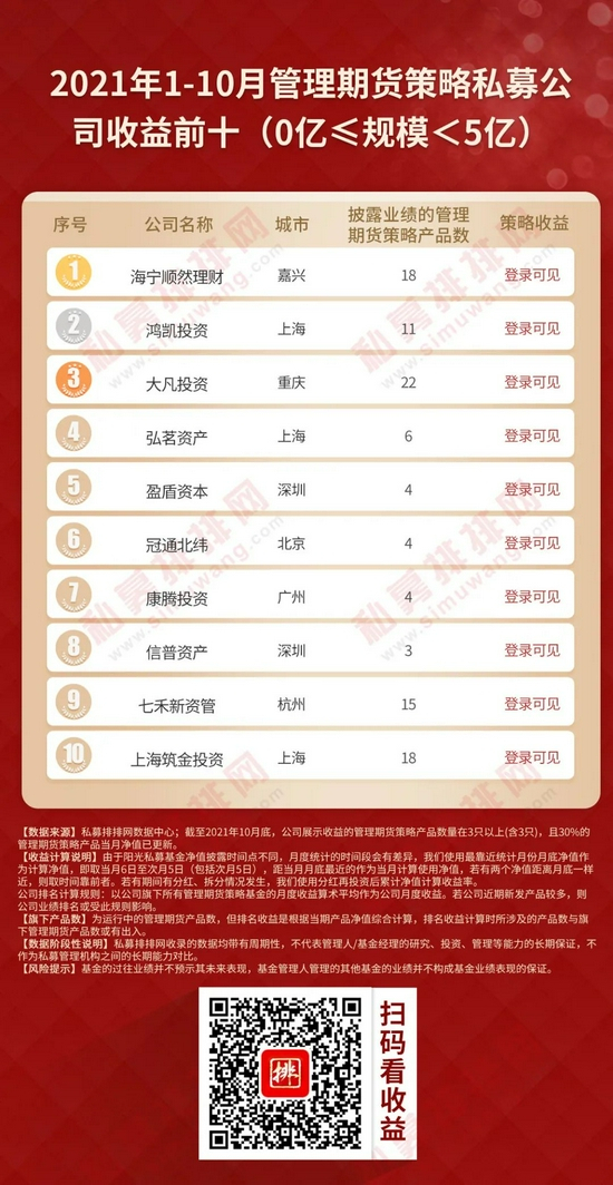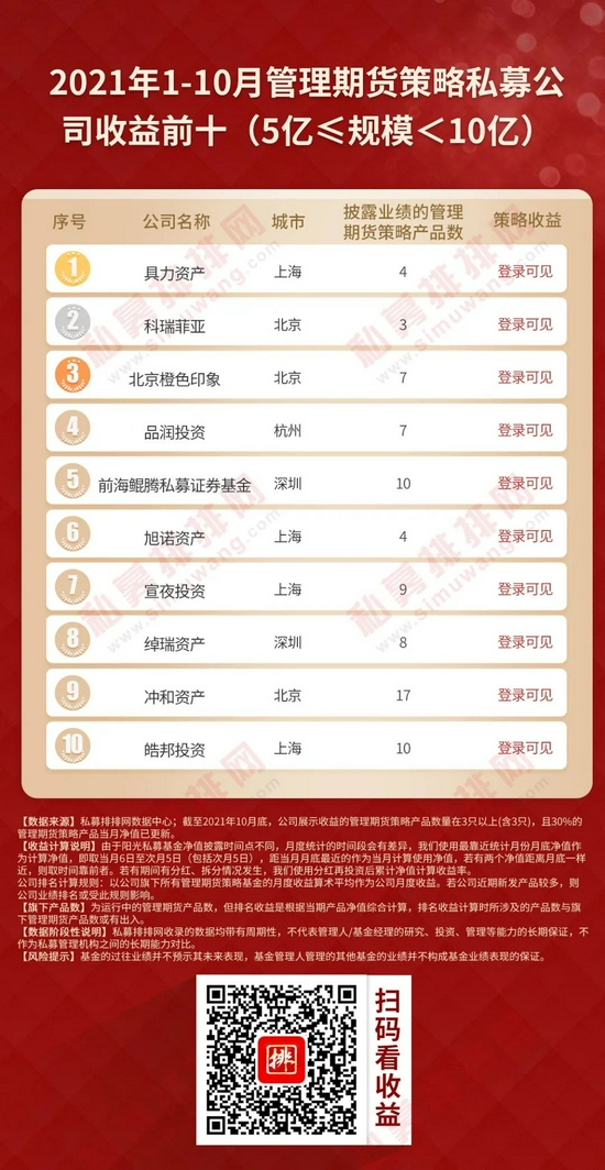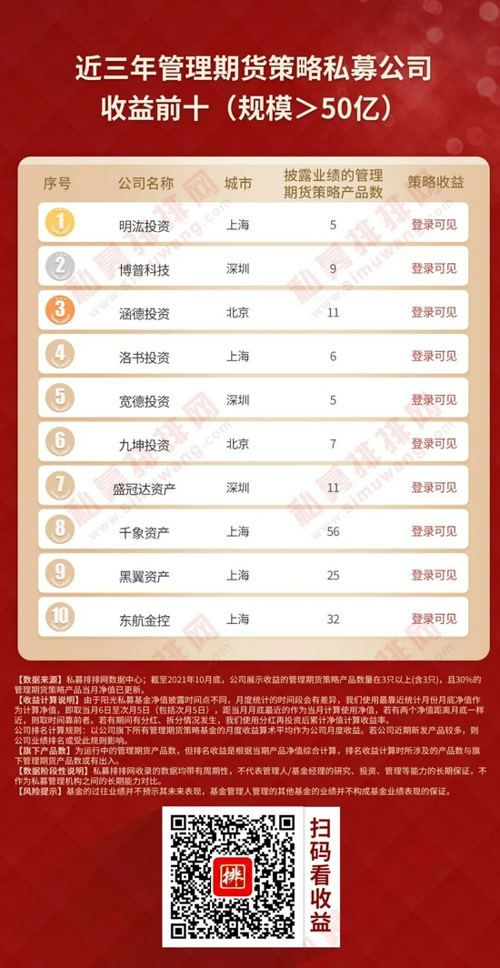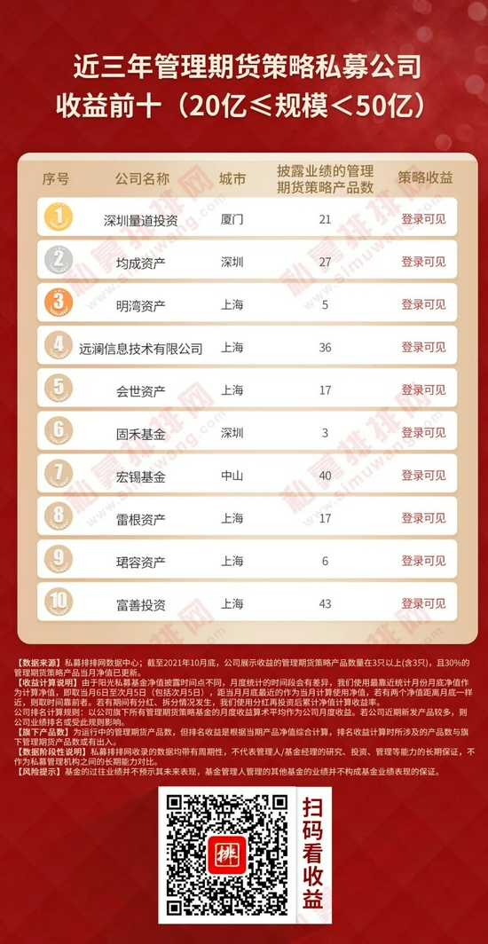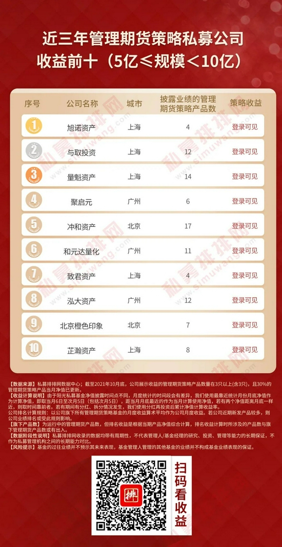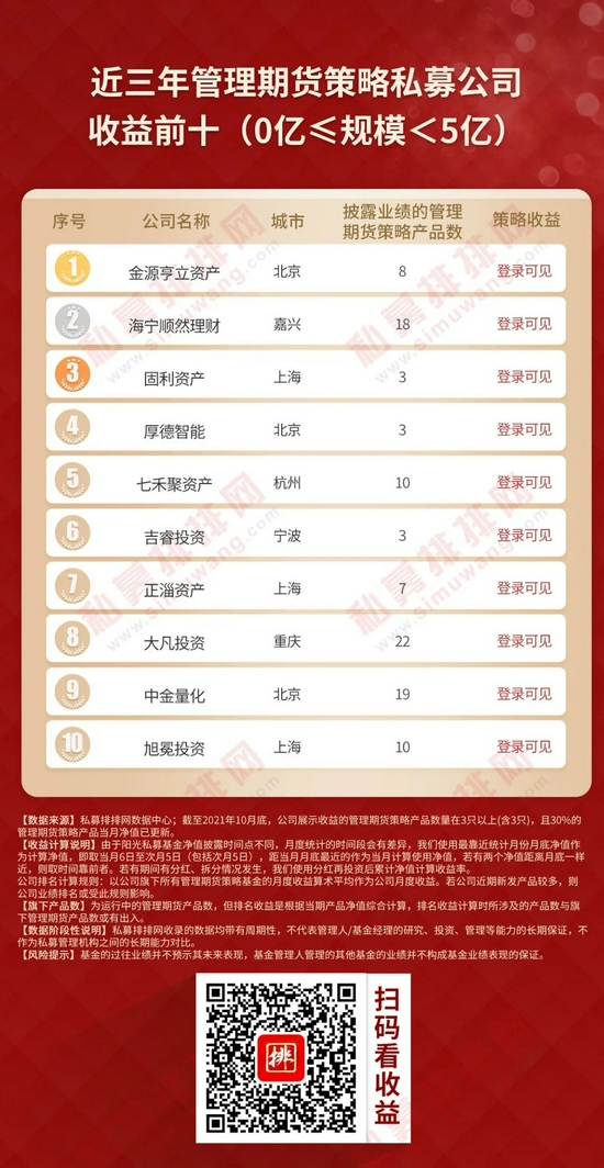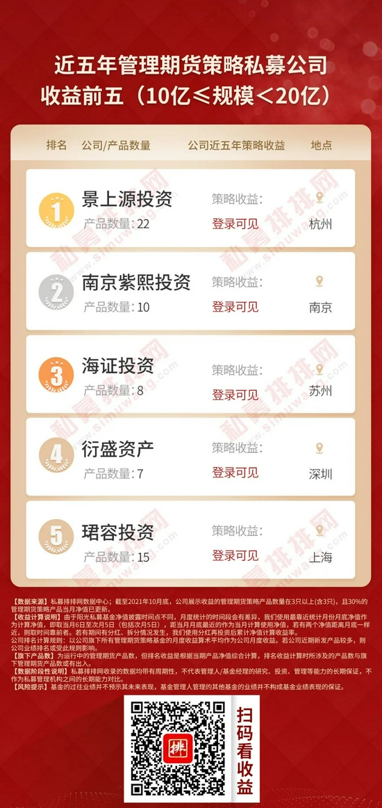 本着公平、公正的原则,私募排排网为广大投资人提供一份不同规模私募榜单,参考私募机构管理规模,将私募机构划分为50亿以上、20-50亿、10-20亿、5-10亿、0-5亿五大类别,筛选出旗下展示净值的管理期货策略产品数量在3只以上(含3只),且3只以上(含3只)产品当月净值已更新的私募机构,按今年以来、近三年、近五年的策略收益率排序,制定出不同规模管理期货私募机构十强榜单。