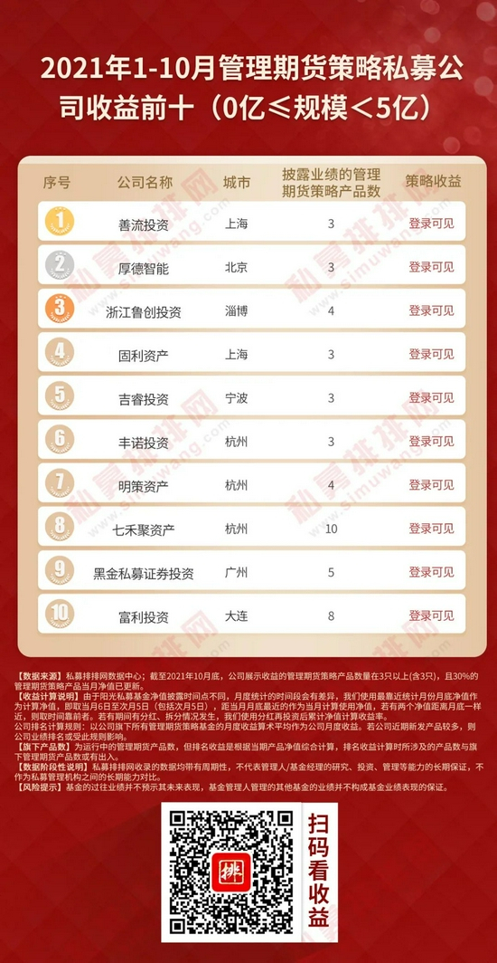 根据私募排排网不完全统计,近五年公司旗下有3只及以上管理期货策略产品展示净值的私募机构共有63家。截至10月底,上述63家期货私募近五年收益全部为正。