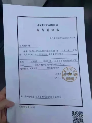 另据网传的一张北京市公安局朝阳分局的拘留单显示,汪超涌已于2021年11月30日因涉嫌职务侵占被北京市公安局朝阳分局刑事拘留,现羁押在朝阳区看守所。目前该消息尚未得到证实。