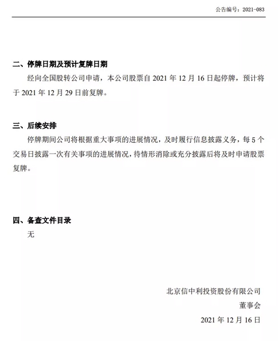 公司称,为保证公平信息披露,维护投资者利益,避免造成公司股价异常波动,根据相关规定,申请公司股票自2021年12月16日起停牌,预计将于2021年12月29日前复牌。至于实控人被传失联一事,信中利方面表示,将根据确认信息完成进一步的信息披露工作,每5个交易日披露一次有关事项的进展情况。