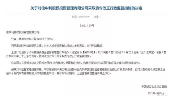 今年4月25日,北京证监局披露对信中利股权投资管理有限公司采取责令改正行政监管措施的决定。经查,北京证监局发现信中利股权投资管理有限公司存在以下行为:利用基金财产或者职务之便,为本人或者投资者以外的人牟取利益,进行利益输送。上述行为违反了《私募投资基金监督管理暂行办法》(证监会令【第105号】,以下简称《暂行办法》)第二十三条(三)之规定。依据《暂行办法》第三十三条之规定,北京证监局决定对该公司采取责令改正行政监管措施。
