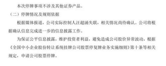 12月16日,新三板挂牌公司信中利发布临时停牌公告称,根据媒体报道,公司实际控制人汪超涌(汪潮涌本名)失联,相关情况尚待确认。公司将根据确认信息完成进一步的信息披露工作。经向全国股转公司申请,公司股票自2021年12月16日起停牌,预计将于2021年12月29日前复牌。
