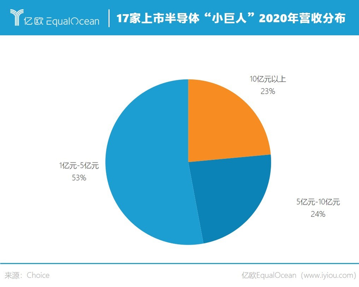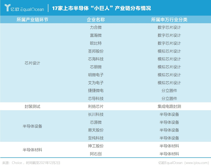 亿欧EqualOcean统计发现,截至12月2日,工信部发布的三批专精特新小巨人名单中,已在A股上市的半导体(注:根据申万行业分类)小巨人共有17家,主要集中在半导体产业链条上的芯片设计、半导体设备、半导体材料、封装测试等环节。