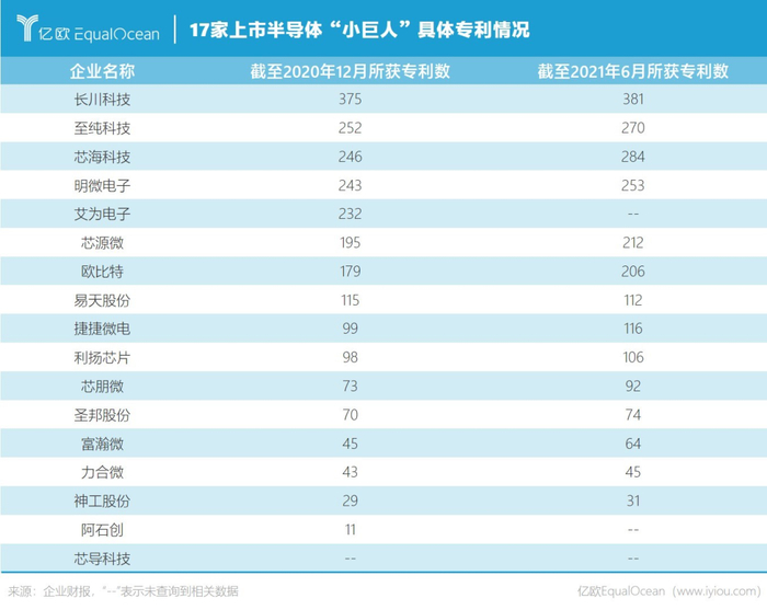 从专利(包括发明专利、实用新型专利、外观设计专利)数据来看,截至2020年,17家企业中,已获专利数超过200件的企业共有5家。其中,长川科技以375件位列第一,其后是至纯科技(252件)、芯海科技(246件)、明微电子(243件)、艾为电子(232件)。