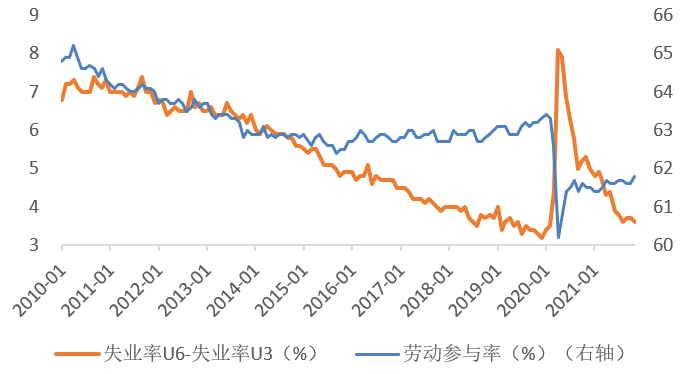 明年联储被迫加息的必要条件是通胀螺旋,而形成通胀螺旋的关键机制是薪资增速和通胀预期的相互作用。当前通胀预期位于历史最高水平,纽约联储11月消费者调查显示:美国消费者未来一年通胀的预期中值为6%,创2013年9月以来最高水平,对未来三年通胀的预期略微回落至4.0%。(见图1)薪资增速也位于历史高位,但相较于历史周期中薪资加速发生在劳动力市场就业饱和后,本次疫情导致的就业不足是薪资上升的直接原因。因此,薪资增速会否回落,会否与通胀预期相互强化形成通胀螺旋,会否逼迫联储提前加息,关键条件是就业缺口会否闭合。