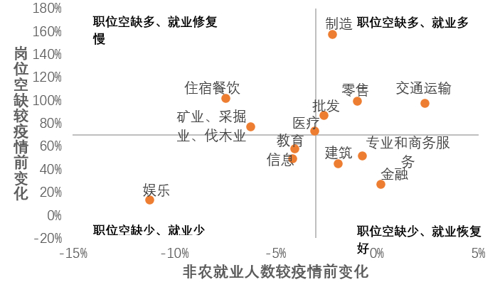图4:各职业根据岗位空缺和就业修复水平分布(2021年10月数据)