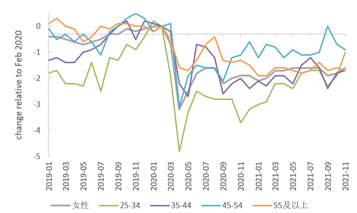 从性别看,疫情后美国男女劳动参与率均有不同程度的下滑(见图6),且尚未修复。疫情期间年龄介于25-34岁的女性劳动参与率降幅比其他人更大 ,这反映了儿童看护造成的压力,但这种差距在最近几个月基本消失。(见图7)这也让女性就业占比超过50%的住宿餐饮服务业成为最缺人手的行业,职位空缺和薪资增速都位于行业前列。(见图5)