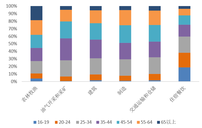 真正可能会持久改变疫情后行业的成本结构的因素是是提前退休和老龄化。自2019年以来,16-64岁美国人口趋势性回落,老龄化导致的劳动力供给减少。进一步细分这部分群体的年龄结构可以发现,真正在疫情后没有恢复的,主要来自55-64岁的群体,最主要的原因是考虑提前退休,这一比例占到了50%。对于55岁以上的劳动者而言,疫情环境下的健康风险远高于年轻人,技能不匹配导致再就业压力更大,且美国政府的三轮财政刺激养老金等居民财富大幅增加,降低了这个年龄群体返回劳动力市场的意愿。因此劳动供应和成本结构受疫情冲击影响持久的主要是农业、能源开采行业这类外籍员工占比较低、平均年龄较高的行业。(见图15)