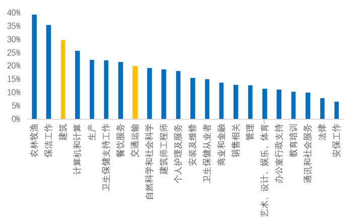 资料来源:Fred,天风证券研究所图10:各行业就业人数中移民占比(2020年数据)