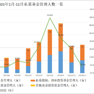 与疫情共处的第二年,私募股权投资市场较2020年整体略有回暖。据中国证券投资基金业协会数据披露,截止2021年11月,本年度共新增1130家私募基金管理人,同比增长7.62%,其中私募股权、创业投资基金管理人共计673家,占比近6成。