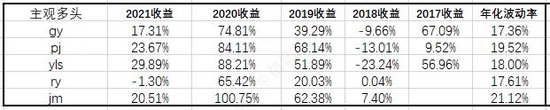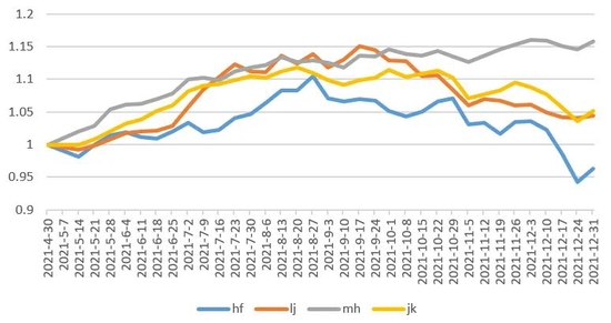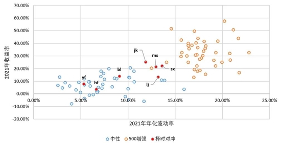 2021年,择时对冲策略平均收益15.53%,但内部分化较为明显,其中,jk、sx收益较高,2021年分别录得25.38%、22%的收益,与此同时年化波动率也较高,均超过12%;yf与hf收益率相对较低,波动率也整体更低。以2021年收益及波动情况为例,我们可以看到,jk、ms、sx、lj整体的收益风险特征更偏向于指增产品,而yf、hf则与中性产品类似。