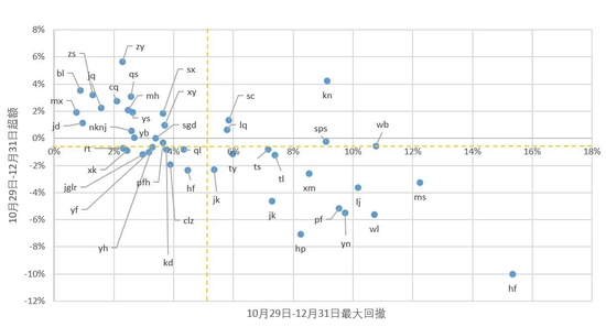 下图列式第三次冲击中,各管理人的超额及最大回撤情况。前两次冲击的数据见之前报告。