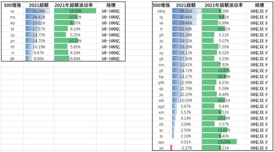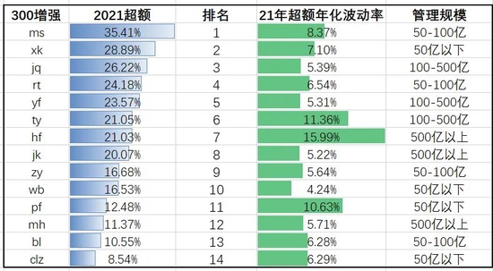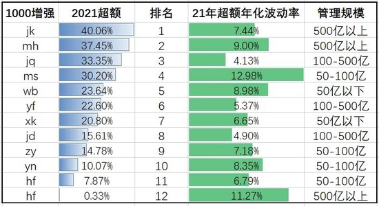 今年,300指数增强超额超过25%的共有3家;其中在超额超过20%的管理人中,xk、jq、rt、yf、jk保持了较低的超额波动率。