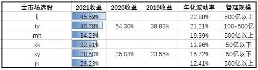 整体来看,2021年,全市场选股的平均收益率为35.04%,平均年化波动率17.26%。我们选取了市场上主观多头的代表性私募产品,2021年平均收益率18.02%,平均波动率18.72%。可以发现,在2021年里全市场选股在长期的波动率上优于主观多头。对于这两者的比较短期时间是不太够的,应该放在更长周期的时间里进行比较。但是量化多头的数据时间不是太长,以下参考2019—2021年的数据。