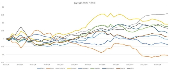将2021年各类风险因子表现拆开来看,可以把今年大致分成几个阶段:2-3月、5月-8月、9月-12月。2月-3月份,抱团瓦解后,价值因子超额收益表现显著,其余因子收益均贡献负收益。5月-8月份,为2021年风险因子中最容易获取收益的时段,长期表现较好的风险因子(例如:成长、盈利、市值流动性、动量等)持续贡献正收益。9月-12月,发生了比较大的反转,长期赚钱的因子均在这段时期产生了负收益,仅有盈利因子能够贡献正收益。