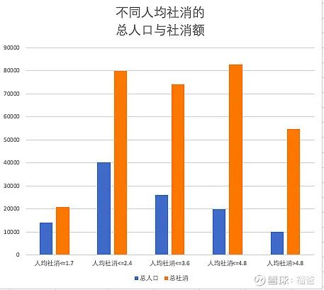 上图是是我做的统计,表示不同的人均社会消费品零售额水平(单位万元/年)下,总人口与总零售额的对应关系,单位分别是万人与亿元。只统计全国人口300万以上的地级市,涉及11.2亿人口,考虑到疫情影响,对2019/2020年数据,择高者录入。对人口3000万以下的省或直辖市略过,他们的人口占比较小,收入或消费数据占比更小。