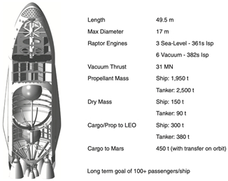 星舰是一款可完全重复使用的飞船(猎鹰系列火箭可回收率在70-80%),也可作为星舰系统的第二级。它高50米,直径9米,有效载荷达100吨以上,载荷容积达1,100m³,其携带的货物最大高度为18米。星舰表面设计有隔热层,具有可重复利用,低维护,快速安装修复的特点。星舰可以作为载体往太空中运输卫星或者向国际空间站运送物资,也可以执行跨行星任务。