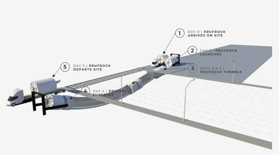 二是研发Prufrock。Prufrock的设计是为了在几周内而不是几年内建造巨型基础设施项目。Prufrock被设计成海豚跳的样子,这意味着它直接从地表发射,在地下挖掘,并在完成后重新出现。这使得Prufrock可以在到达现场后48小时内开始挖隧道,并且不需要开挖昂贵的坑道来发射和回收机器。Prufrock的设计是以每周1英里的速度进行隧道建设,这比The Boring Company的上一代TBM(Godot-Plus)快6倍。