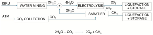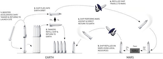 火星规划分为6步。第一步是通过超级重型火箭加速星舰,并回收超级重型火箭。第二步星舰飞船进入地球轨道。第三步是在地球轨道上加注推进剂,这一步是通过多艘星舰在轨对接完成。第四步是已加注推进剂的星舰飞向火星并降落。第五步是在火星上加注推进剂,火星上的推进剂通过利用火星已有的水(以地下冰形式存在)和二氧化碳生产,具体的化学反应过程见图表。第六步是返回地球。