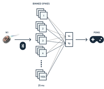 该实验将Links放置在猴子的运动皮层区域,左右半脑各一个,左侧的运动皮层控制右侧身体,右侧的运动皮层控制左侧身体。运动皮层中的神经元在运动之前和运动期间调节它们的活动,并且参与计划、启动和控制任何运动。运动皮层中的许多神经元是定向调整的,即在特定运动方向比其他神经元更活跃。不同的神经元被调整到不同的运动方向。通过对不同神经活动模式与预期运动方向之间的关系进行建模,可以构建一个可以预测即将发生或预期运动的方向和速度的模型。通过这一模型,猴子可以完美地完成PONG游戏并获得最终的香蕉奖励。