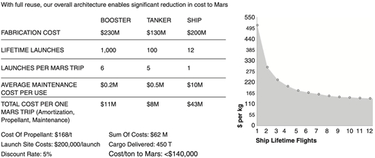 对于星舰系统的成本,由于是完全可利用,随着重复利用次数增多,每千克发射费用逐渐下降,最终发往火星每吨费用可降至140,000美元。