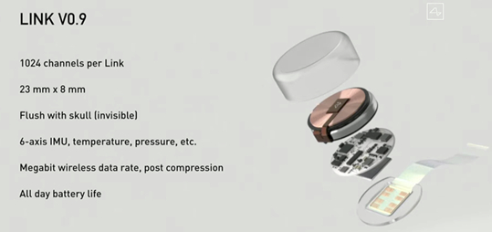 公司目前的脑机接口为LINK V0.9。这款脑机接口具有如下特点:有1024个通道,体积仅有23 mm(直径)×8 mm(厚度),植入式(外部不可见),集成6轴惯性测量单元、温度传感器和压力传感器,MB量级无线数据传输,无线充电,续航一天。这款脑机接口已在2020年7月获得美国FDA设备认证,并在通过安全测试后用于人体试验。