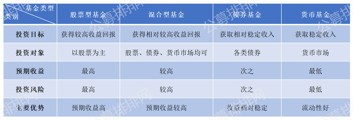 在此,我们重点讲述根据投资对象不同产生的不同基金类型。从投资风险来看,股票型基金风险最大,混合型基金次之,其次是债券基金,货币基金则是风险最小。
