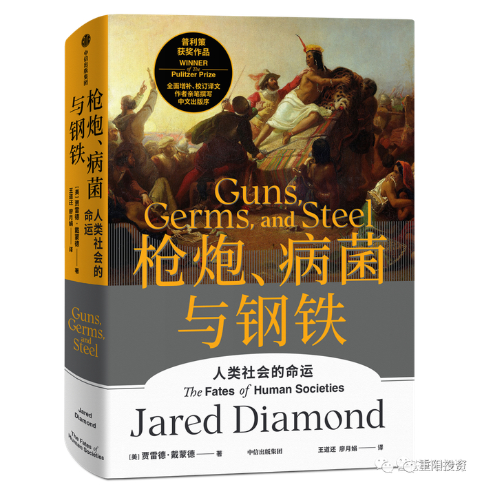 投资要有宏大的格局,而格局必须要由壮丽的历史观来构建,这样才有可能展现深邃的视野,从而构建格栅思维。《枪炮、病菌与钢铁》就是这样的一本史诗级的鸿篇巨制,它可以帮助我们构建宏大的格局。这部巨著我在十多年前曾读过,但那时却没有这样的认知。实际上,这本书当年查理·芒格先生曾推荐过。最近,中信出版集团又重版了这部辉煌的巨著,中文译者王道还、廖月娟。作者贾雷德·戴蒙德。这是戴蒙德历史三部曲中的一部。其他两部则是《第三种黑猩猩》和《崩溃》。