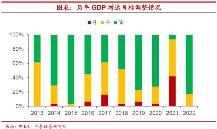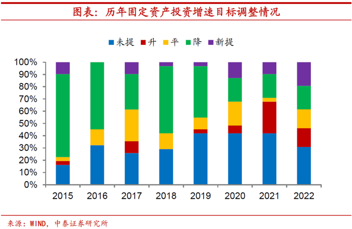 八成省份目标下调,压力堪比2015。从2021年各省目标完成情况看,29个省份中有23个省份完成GDP增速目标,达标情况远好于往年水平,而以往每年未达地区经济增速目标的省份数量并不算少。从全国看,经济增速未达标的年份比较少见。从2022年各省的经济增速目标来看,29个省份中有24个省份下调经济增长目标,占比超过80%,目标下调程度堪比2015年,经济面临的压力可见一斑。为什么在去年多数省份超额完成目标的情况下,今年还会见到增速目标的大范围下调呢?首先,疫情造成的低基数使得去年目标完成相对容易。而随着这一影响的消退,今年经济增速目标完成的难度有所上升。其次,经济增速目标下调成为趋势。随着我国经济潜在增速的下降,设置过高的经济增速目标既违背规律,又无必要。最后,增速目标的设置要考虑到预期的合理引导。我国经济发展面临“需求收缩、供给冲击、预期转弱”三重压力,而多个省份对目标设置的解释中也提到了有助于引导预期。我们认为,全国经济增长目标的设定也会对此有所考量,5%-5.5%的增速区间较为适宜。