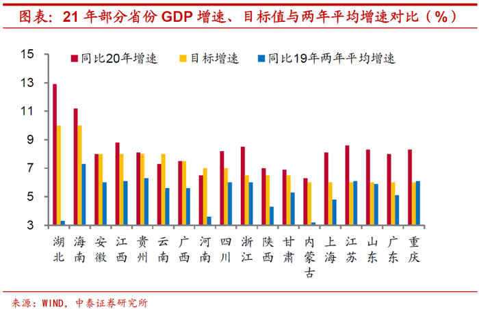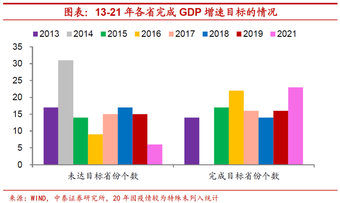 达标情况远超往年。事实上,对比以往各省GDP增速目标完成情况,如此高比例的达标比较少见。在2013年-2019年,未完成目标的情况在每年并不是少数,最少的一年也有9个省份,比例接近三分之一。其中2016年的情况与今年较为类似,但2016年各省超额完成GDP增速目标均在1个百分点以内,而21年有多达11个省份实际GDP增速超过目标增速1个百分点以上,有的甚至超过2个百分点。