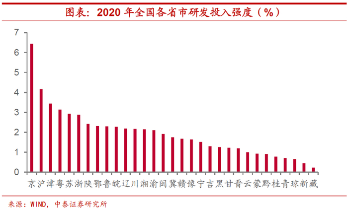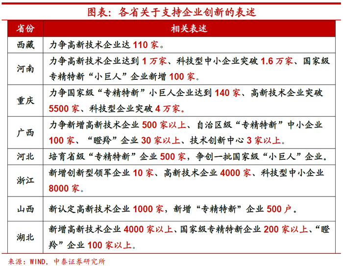 在创新驱动方面,部分省市直接将研发投入强度列入全年目标。而从具体的工作部署上来看,主要集中于三个方面的建设:一是搭建创新平台。如河南省提到要“重建重振省科学院,与中原科技城、国家技术转移郑州中心融合发展”,北京市提出要“着力打造世界领先的科技园区”,重庆市提到要“高水平建设西部(重庆)科学城”、“建设金凤实验室和国家应用数学中心,推动国家实验室基地、中科院重庆汽车软件创新研究平台落地”;二是扶持创新主体。虽然政府和高校在基础研究和创新平台搭建方面具备一定的优势,但创新主体仍然在于企业,因此部分省市在全年工作中提到要争取进一步增强企业的创新能力,特别是增加“专精特新”和“小巨人”企业数量;三是营造创新生态。主要聚焦在科技体制改革和创新人才的吸引。如湖北省提到要“推进科技体制改革三年行动,打造政产学研金服用创新创业共同体”,山西省提出要“大力实施新时代人才强省战略”。