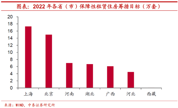 保障房建设或将发力,拉动投资近2个百分点。近期住建部召开全国住房和城乡建设工作会议指出,保障性租赁住房建设是今年的重点任务。住建部明确,以人口净流入的大城市为重点,全年建设筹集保障性租赁住房240万套,这一数量约是2021年的两倍多。而多地在政府工作报告中也公布了全年的保障性租赁住房的筹措目标,其中以上海和北京最为突出。据我们的估算,今年全年保障性租赁住房带来的新增投资额约在2500亿元,将拉动地产投资1.5至2个百分点。