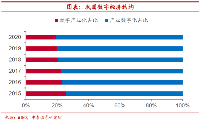 一是数字经济。《“十四五”数字经济发展规划》中提到,2020年,我国数字经济核心产业增加值占GDP比重达到7.8%,而2025年这一比值预计将达到10%。而数字经济可以分为产业数字化和数字产业化两大部分,产业数字化意味着对现有产业的数字化改造,其规模远大于数字产业化部分,在数字经济高速发展的背景下,不少产业面临着广阔的改造空间。如河南省提出今年“大力推动数字河南建设,力争数字经济增长15%以上”,重庆市明确要“创建中国软件名园、国家网络安全产业园区”,并“打造10个‘5G+工业互联网’试点示范项目”。