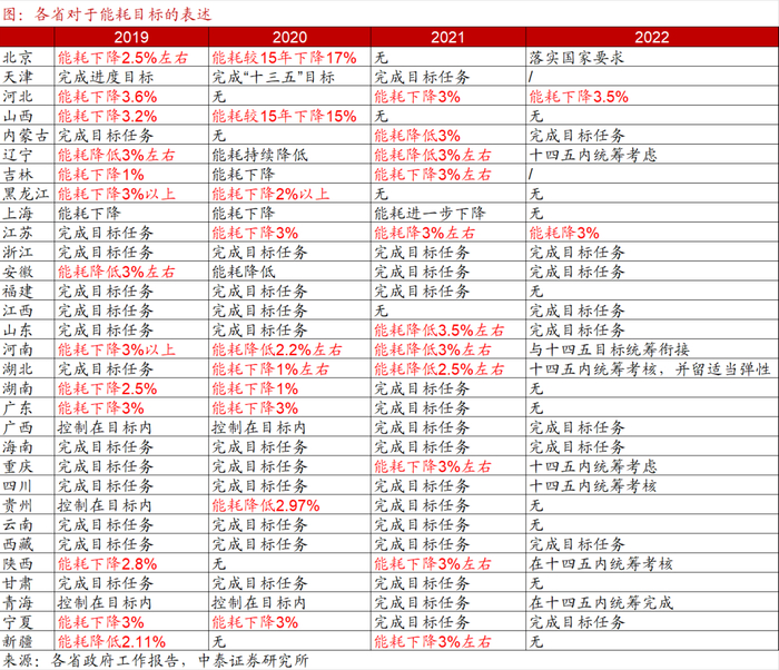 最后,能耗目标有所淡化,稳妥有序推进双碳。2021年“碳达峰碳中和”首次被写入政府工作报告,这也是去年全年政府工作的焦点所在,但部分地区过于僵化的政策执行也产生了如能源短缺和大宗商品价格攀升等副作用。去年底中央经济工作会议明确要“正确认识和把握碳达峰碳中和”、“不可能毕其功于一役”、“能耗‘双控’向碳排放总量和强度‘双控’转变”。从今年各地政府工作报告中的部署来看,一方面,能耗目标有所淡化。不少省市不再将单位GDP能耗下降具体化,而表述为“完成国家下达目标”或“在十四五规划期内统筹考虑”;另一方面,“双碳”工作推进更加强调“有序”、“稳妥”,如浙江省提出“坚决避免‘一刀切’、运动式‘减碳’”。
