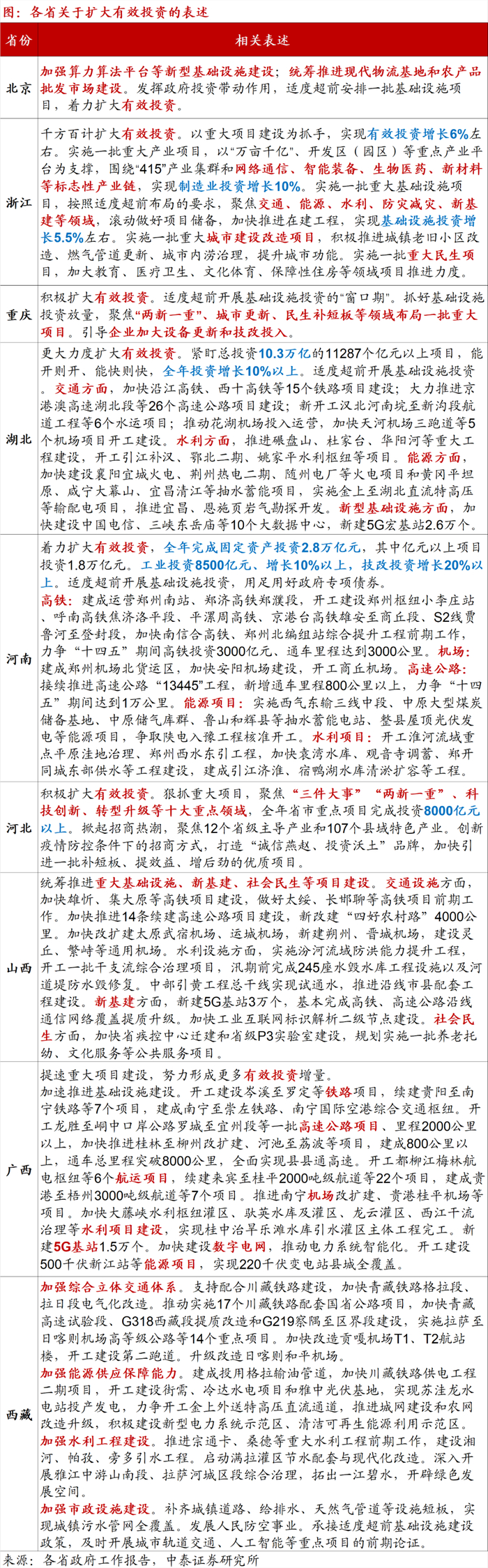 从各地稳增长的工作部署上来看,多数将扩大有效投资作为重要抓手。一方面,虽然今年从各省投资增速的目标设定上,并未表现出整体上的大幅上升,但“有效”的要求意味着资金运用更加精准,注重经济和社会效益的发挥,并非盲目地“铺摊子、上项目”;另一方面,扩大有效投资以重大工程为依托,方向集中在基础设施建设。“适度超前建设基础设施”的要求使得各地纷纷推进包括交通、水利、能源和新基建等投资项目。如湖北、广西和山西均明确了全年新增5G基站目标,湖北、河南、山西、广西和西藏也确立了机场、铁路和公路等交通运输项目共同推进的局面。此外,部分省市将医疗、教育等民生项目建设也纳入到了扩大有效投资的范畴。
